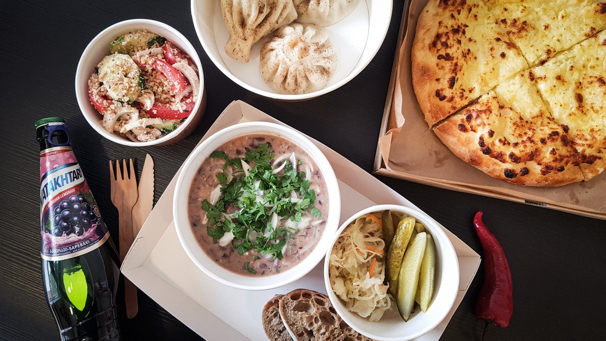 Klasikiniai/kalnu stiliaus. Тešlos maišeliai su mėsa ir sultiniu viduje. Pageidaujant patiekiami su Kartveliškais juodaisiais/raudonaisiais pipirais, 3vnt/520g