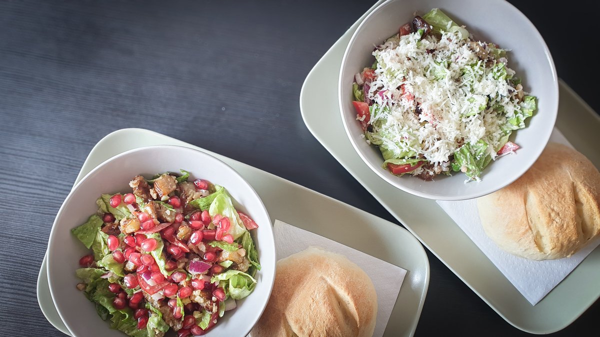 Baklažanai, saldžiosios paprikos, lapinės salotos, svogūnai, graikiniai riešutai, padažas, granatų sėklos/sūris) + naminė duonelė