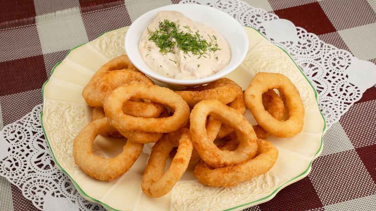 Kalmarų žiedai su padažu