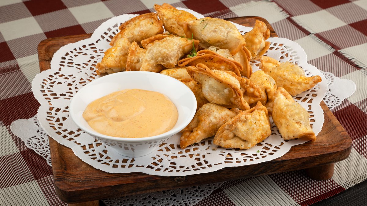 Koldūnai fri su vištiena ir pasirinktu padažu