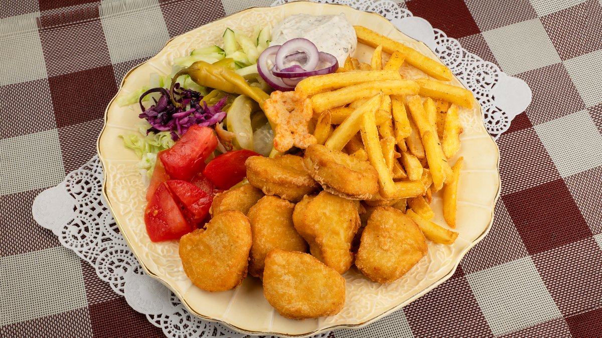 Bulvytės fri, nuggets, kiniškas kopūstas, pomidorai, agurkai, marinuoti agurkėliai, raudonas kopūstas, padažas