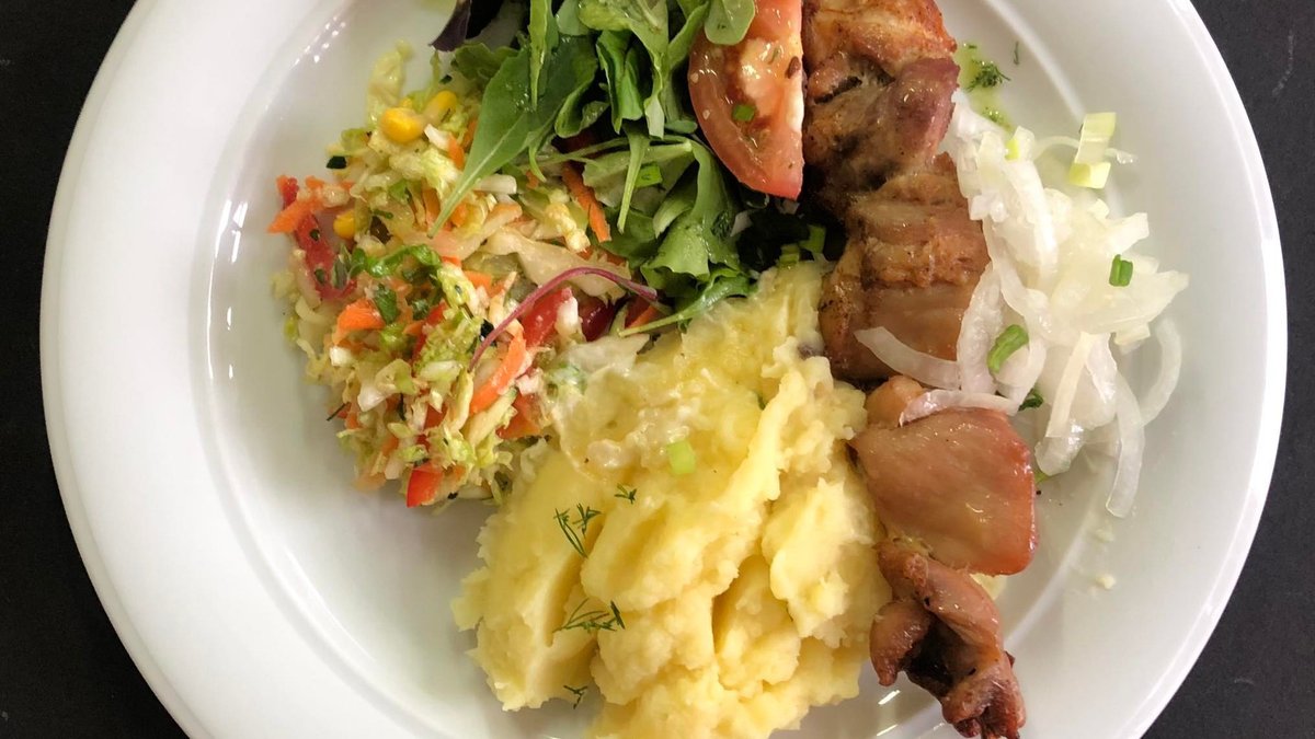 Kiaulienos sprandinės iešmelis su marinuotais svogūnais ir adžika