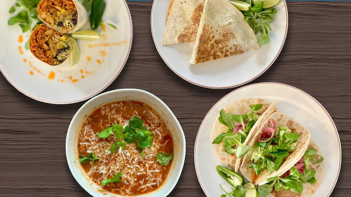 Čipotlė vištiena, ispaniški ryžiai, sūris, meksikietiškos pupelės, kukurūzai, gvakamolė, pomidorų salsa, čipotlės padažas
