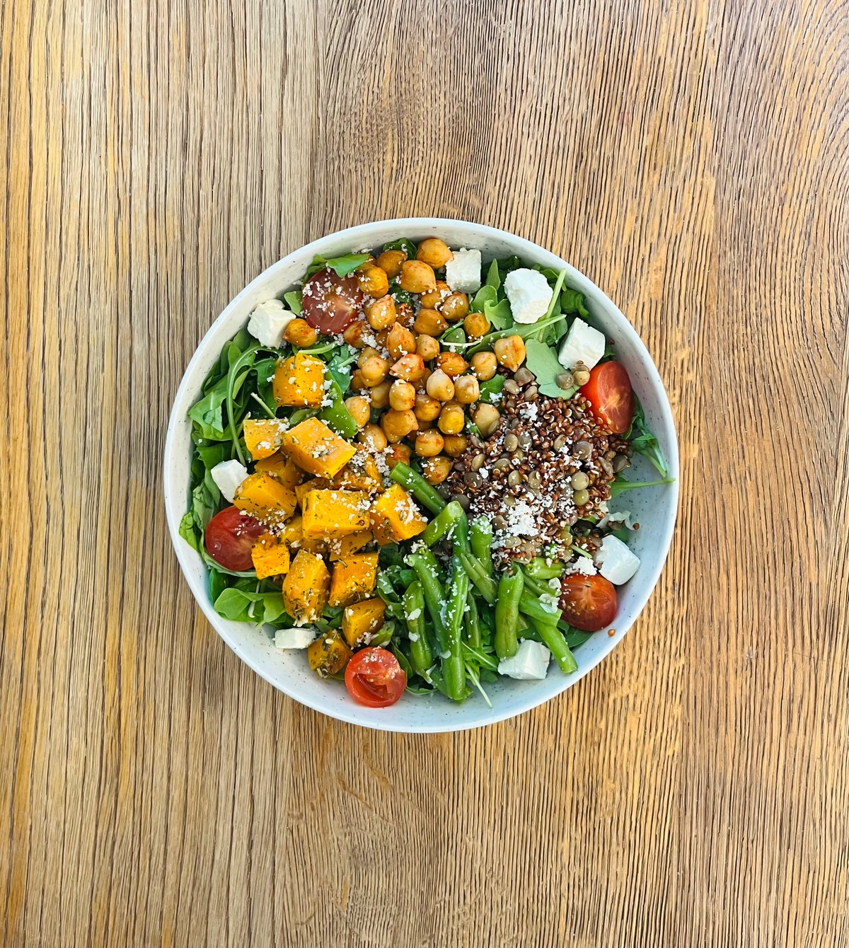 Salotų asorti, kepti avinžirniai, moliūgas, šparaginės pupelės, pomidoriukai, cukinija, fetos sūris, kietas sūris, salotų dressingas