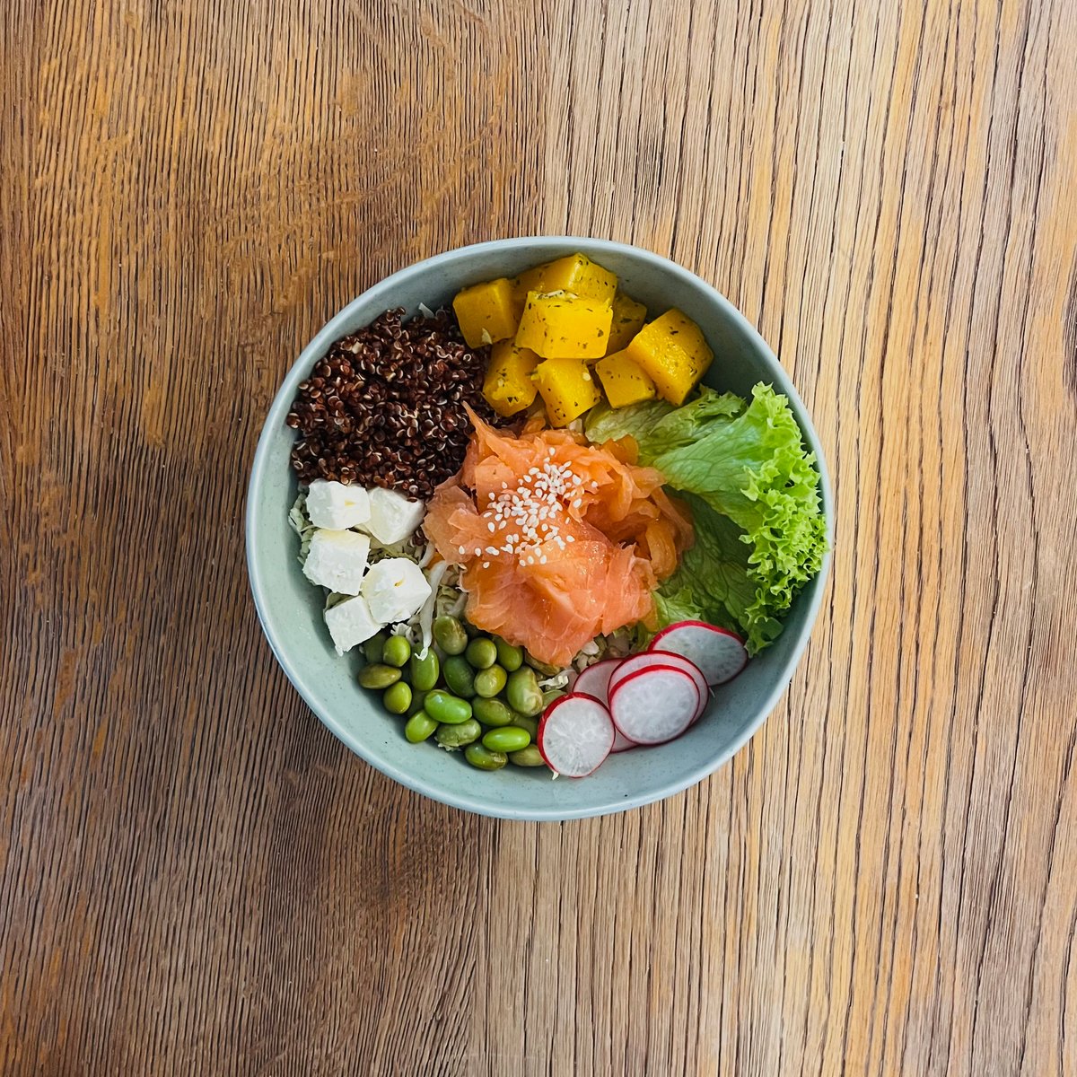 Salotų dubuo su rūkyta lašiša, keptu moliūgu, sojų pupelėmis ir bolivine balanda