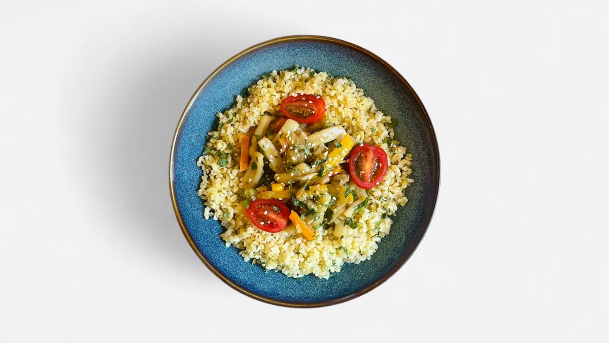 Kalmarų troškinys su bulguru ir daržovėmis