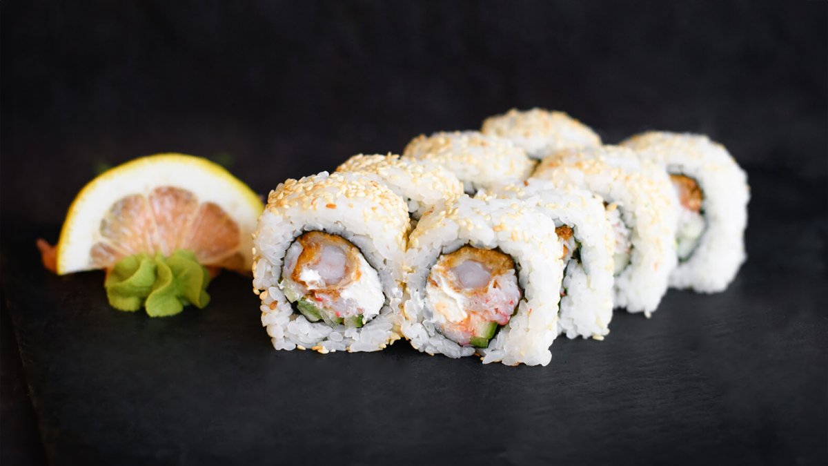 Kepta krevetė tempuros tešloje, agurkas, Philadelphia sūris, krabų lazdelės, sezamų sėklos, aštrusis padažas(8 vnt.)