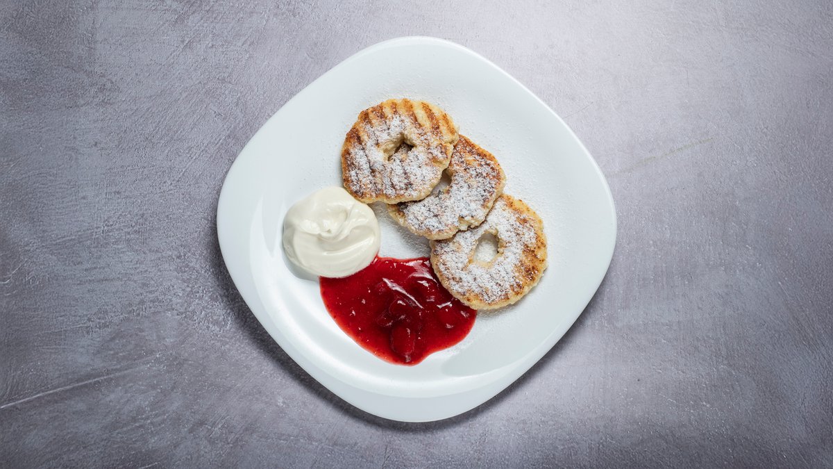 Gruzdinti bulviniai blynai su česnakiniu varškės padažu ir kepta šonine