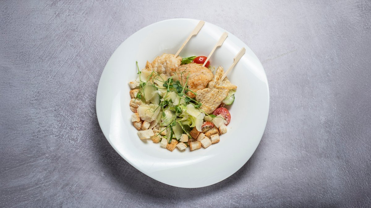 Salotos, agurkai, pomidorai, baltos duonos skrebučiai, cezario padažas, kietasis sūris, višteinos filė