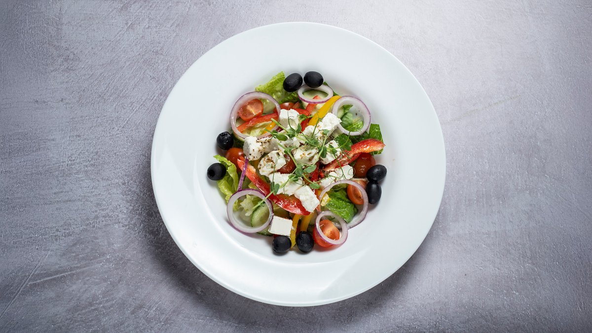 Salotos, agurkai, pomidorai, paprikos, svogūnai, alyvuogės, Feta sūris, užpilas