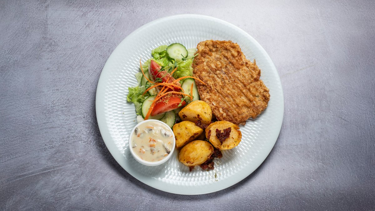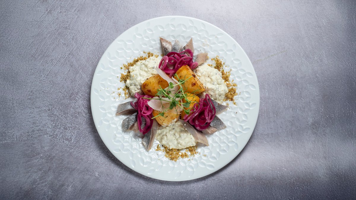 Silkė su bulvėmis ir česnakiniu varškės padažu