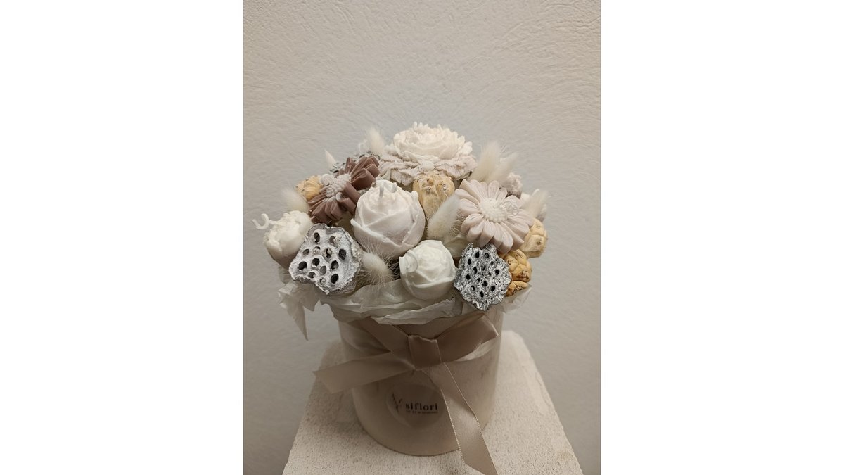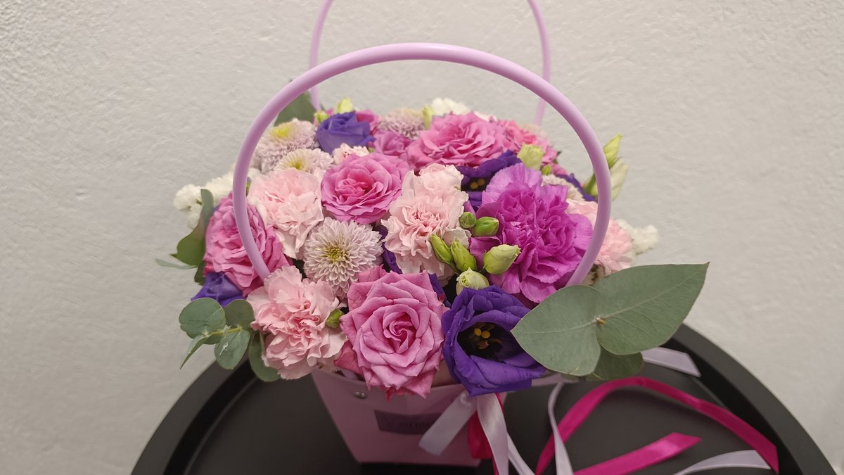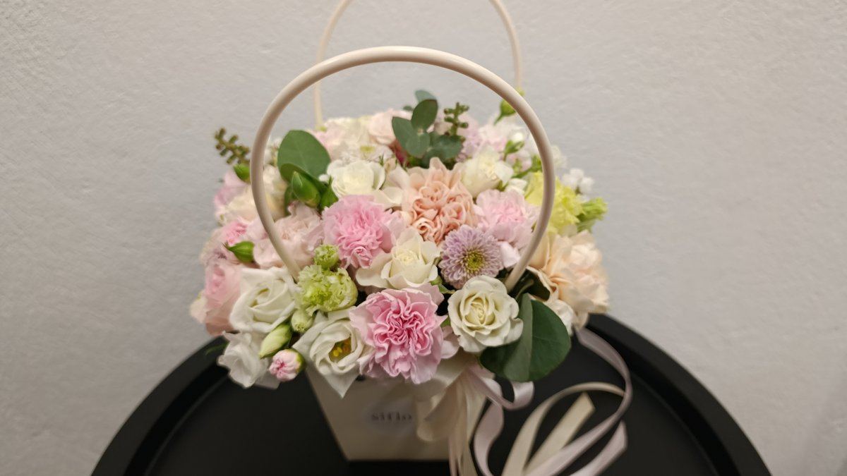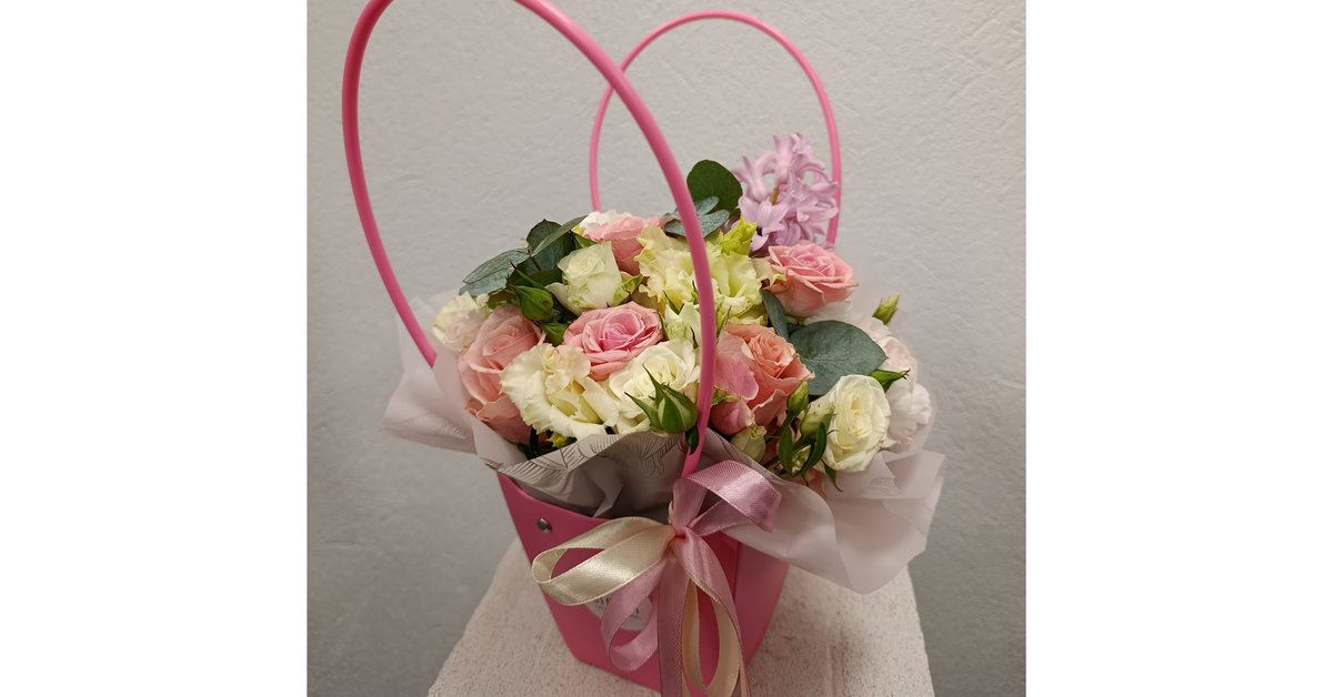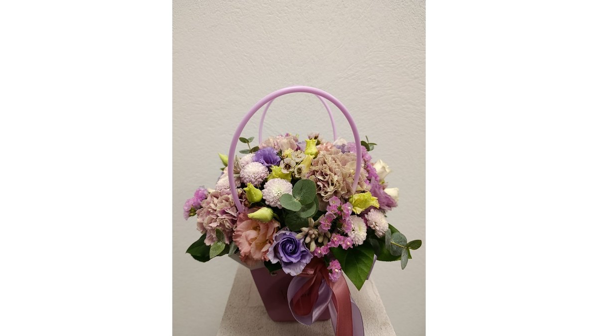 Pastelinių spalvų gėlės krepšelyje