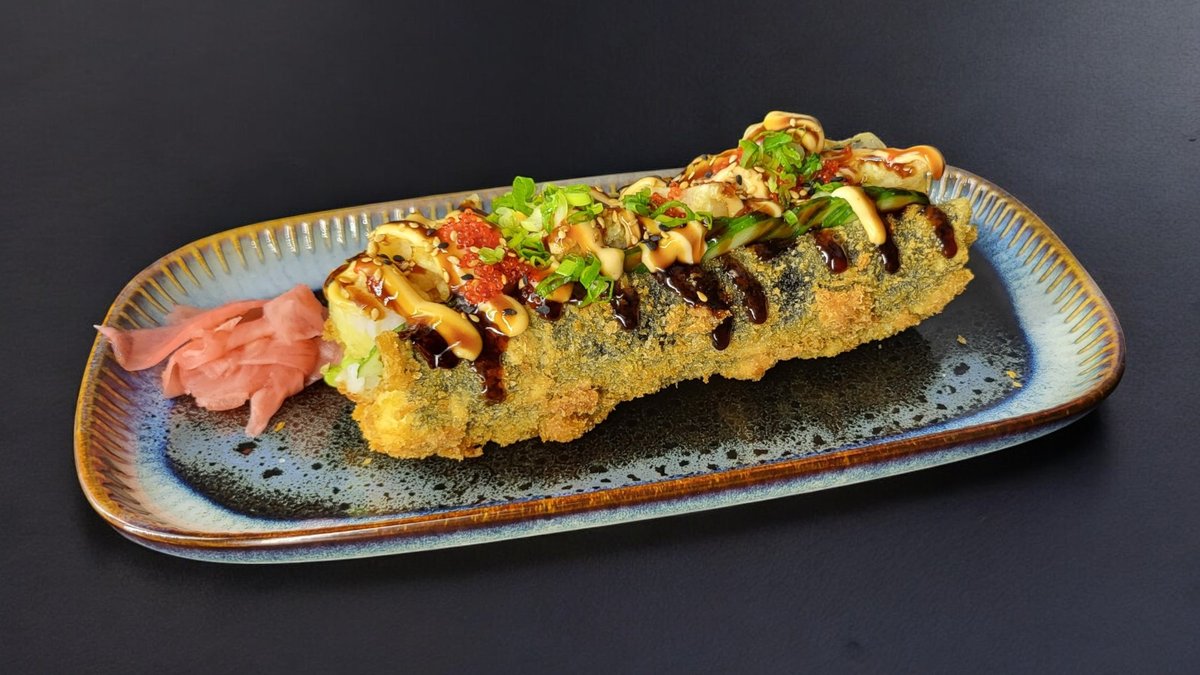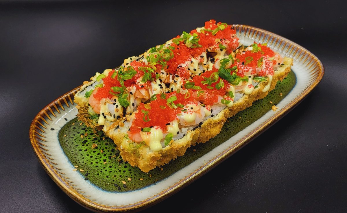 Ryžiai, virtos krevetės, agurkai, wakame, kreminis sūris, tobiko ikrai, karai padažas, wasabi majonezas, kepintas sezamas, panko džiūvesėliai, tempura