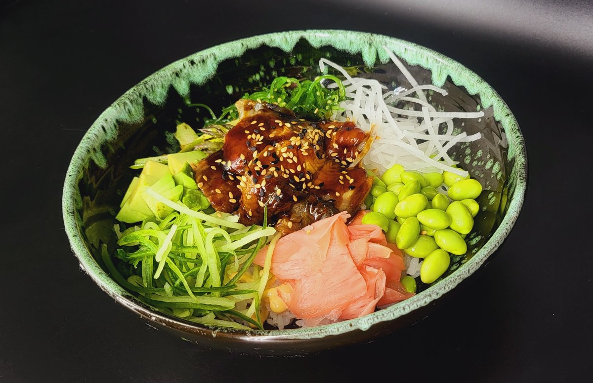 Ryžiai, vištiena, kreminis sūris, avokadas, agurkas, traškūs svogūnai, teriyaki padažas, karai padažas, kepintas sezamas, svogūnų laiškai, panko džiūvesėliai, tempura