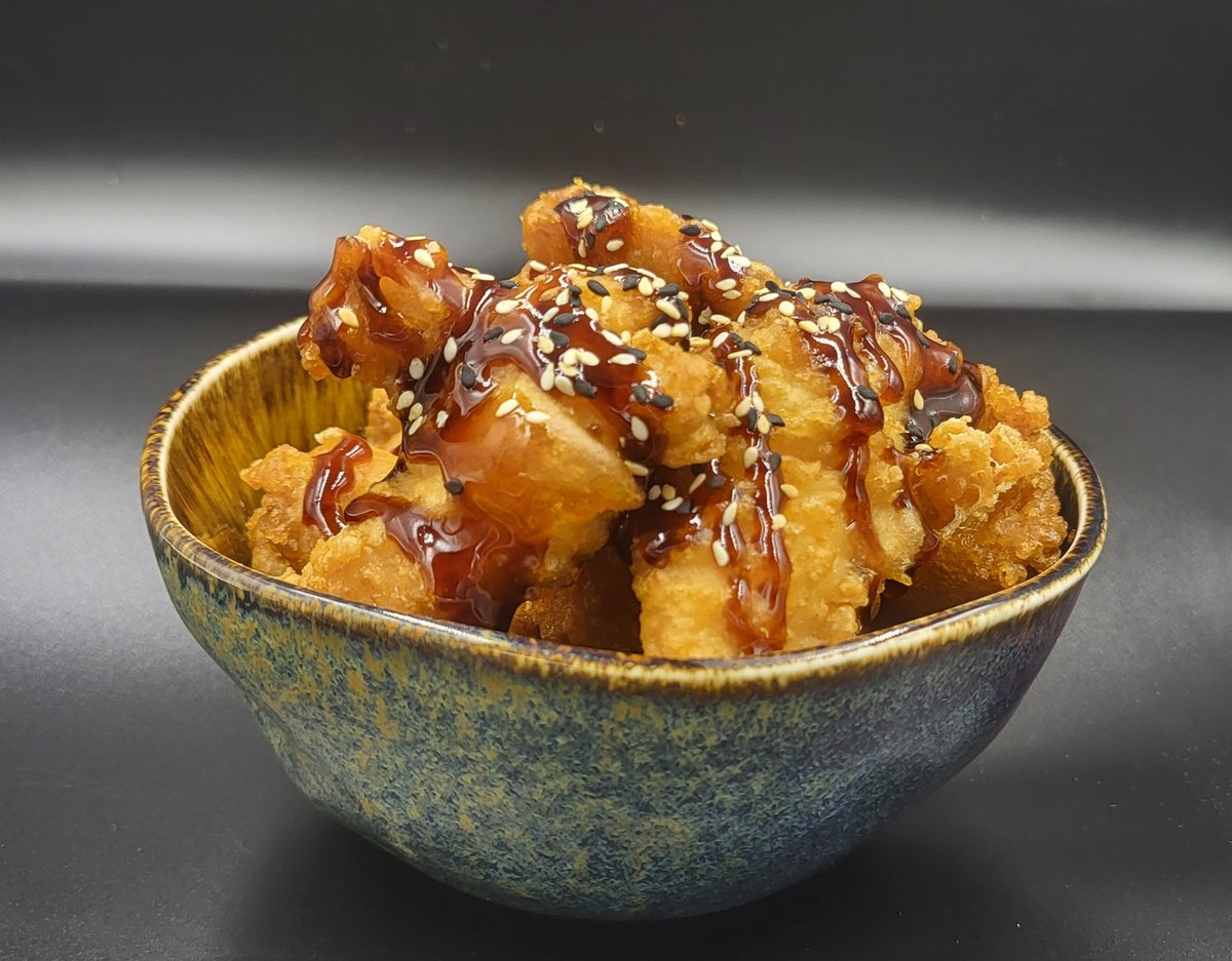 Ryžiai, traški vištiena, kreminis sūris, agurkas, Teriyaki padažas, karai padažas, panko džiūvesėliai, ridikėlių daigai, tempura