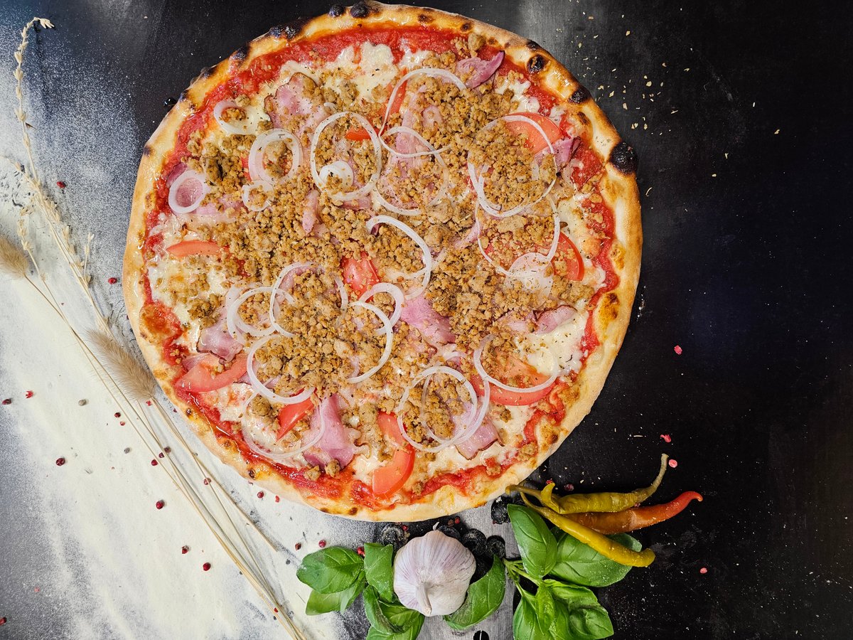 Sūris, šoninė, kiaulienos faršas, svogūnai, pomidorai