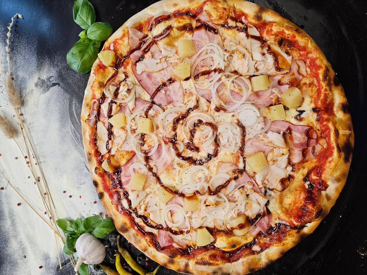 Sūris, vištiena, šoninė, svogūnai, ananasai, BBQ padažas