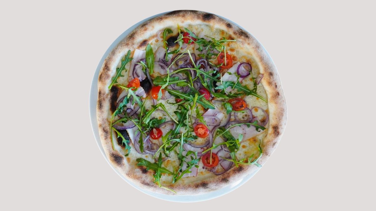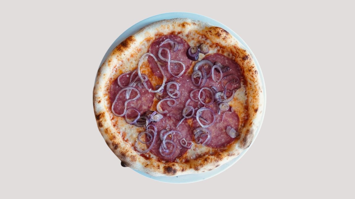 Pomidorų padažas, mozzarella sūris, Milano saliamis, svogūnai