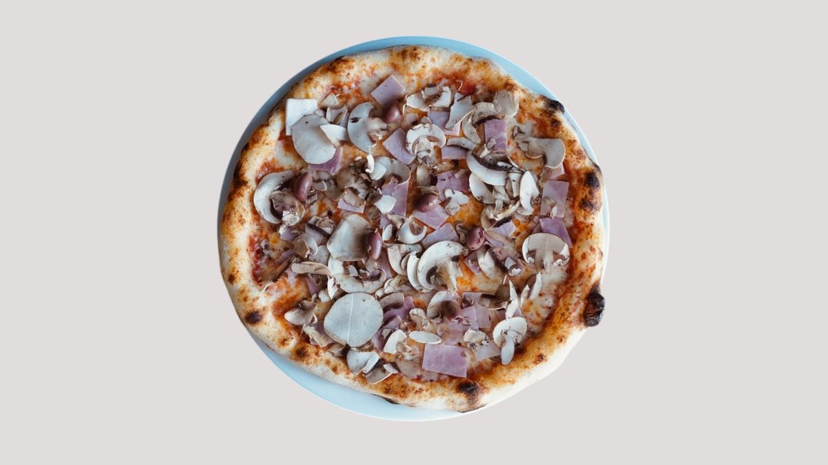 Pomidorų padažas, mozzarella sūris, virtas kumpis, grybai, alyvuogės