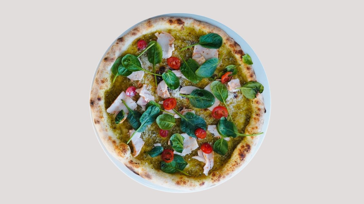 Pesto padažas, šviežūs špinatai, pomidoriukai, vištiena, parmezano sūris