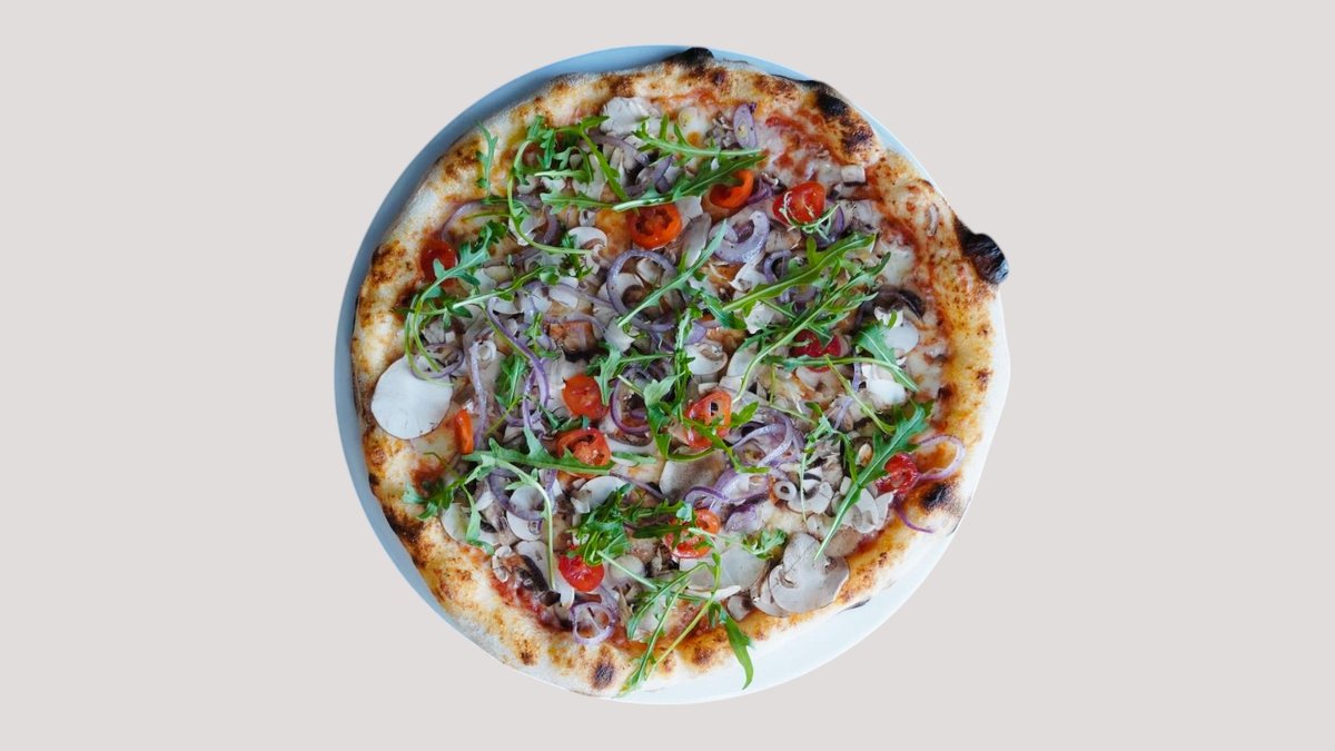 Pomidorų padažas, mozzarella sūris, pievagrybiai, svogūnai, pomidoriukai, rukola