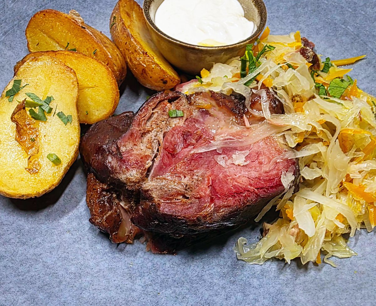 Kiaulienos karka, patiekiama su troškintais kopūstais, keptomis bulvėmis, daržovių padažu
