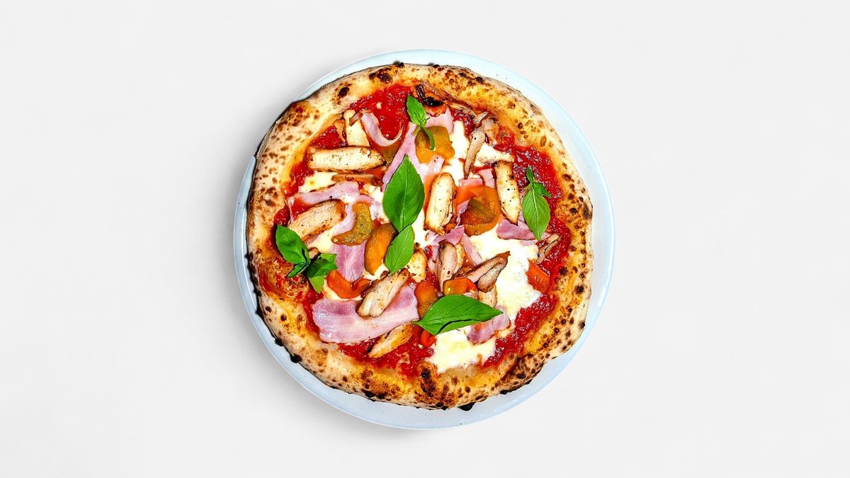 (pomidorai savo sultyse, sūris mozzarella, alyvuogių aliejus, švž. bazilikai kepta vištiena, š/r šoninė, kepta paprika)