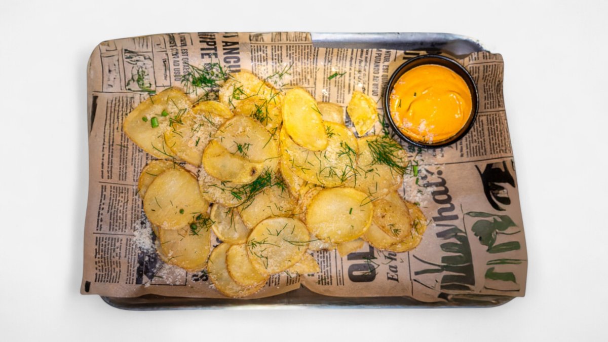 Bulvių traškučiai pagardinti kietuoju sūriu