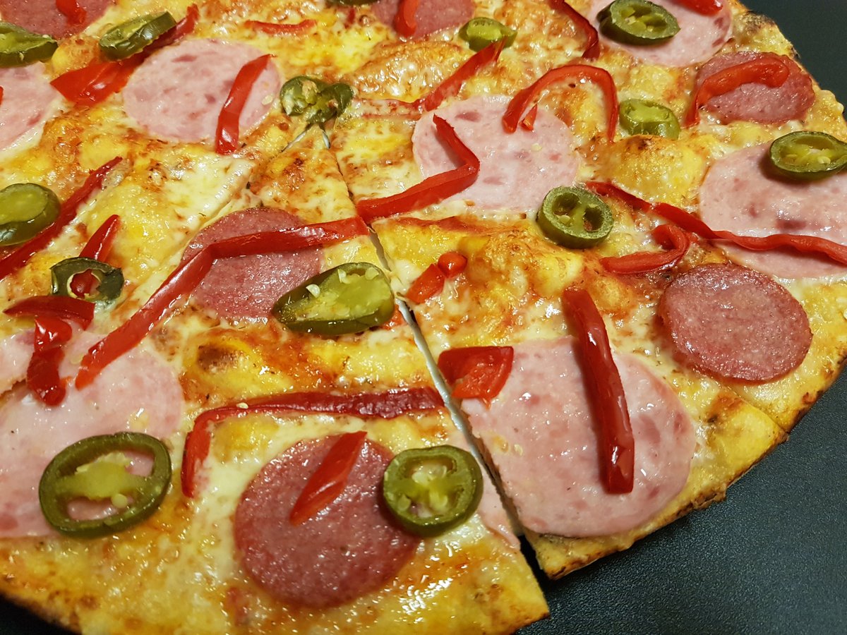 Pomidorų padažas, fermentinis sūris, kiaulienos faršas, paprika, jalapenai, aštrus padažas