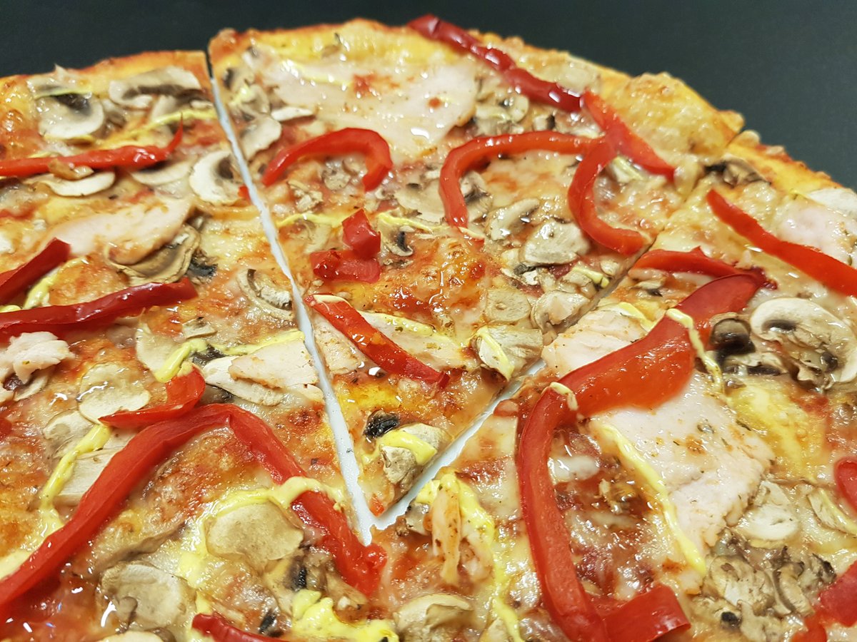 Pomidorų padažas, fermentinis sūris, pievagrybiai, vištienos filė, šoninė, svogūnai