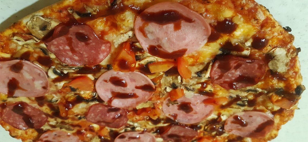 Pomidorų padažas, fermentinis sūris,plėšyta kiauliena,paprika,alyvuogės,barbekiu padažas
