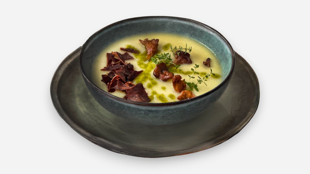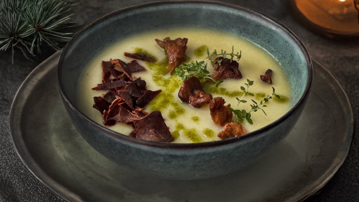 Kreminė bulvių sriuba su voveraitėmis ir kumpio traškučiais