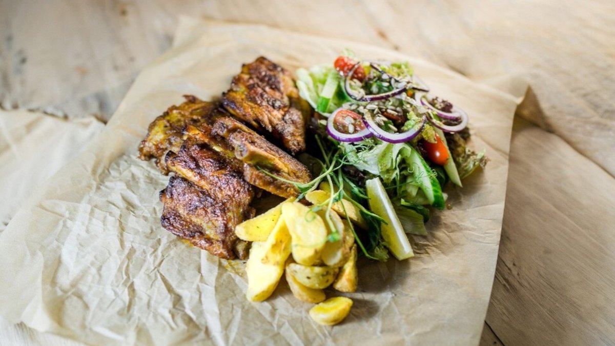 Šonkauliukai glazūruoti su BBQ padažu, patiekiami su šviežiomis daržovėmis ir bulvių skiltelėmis