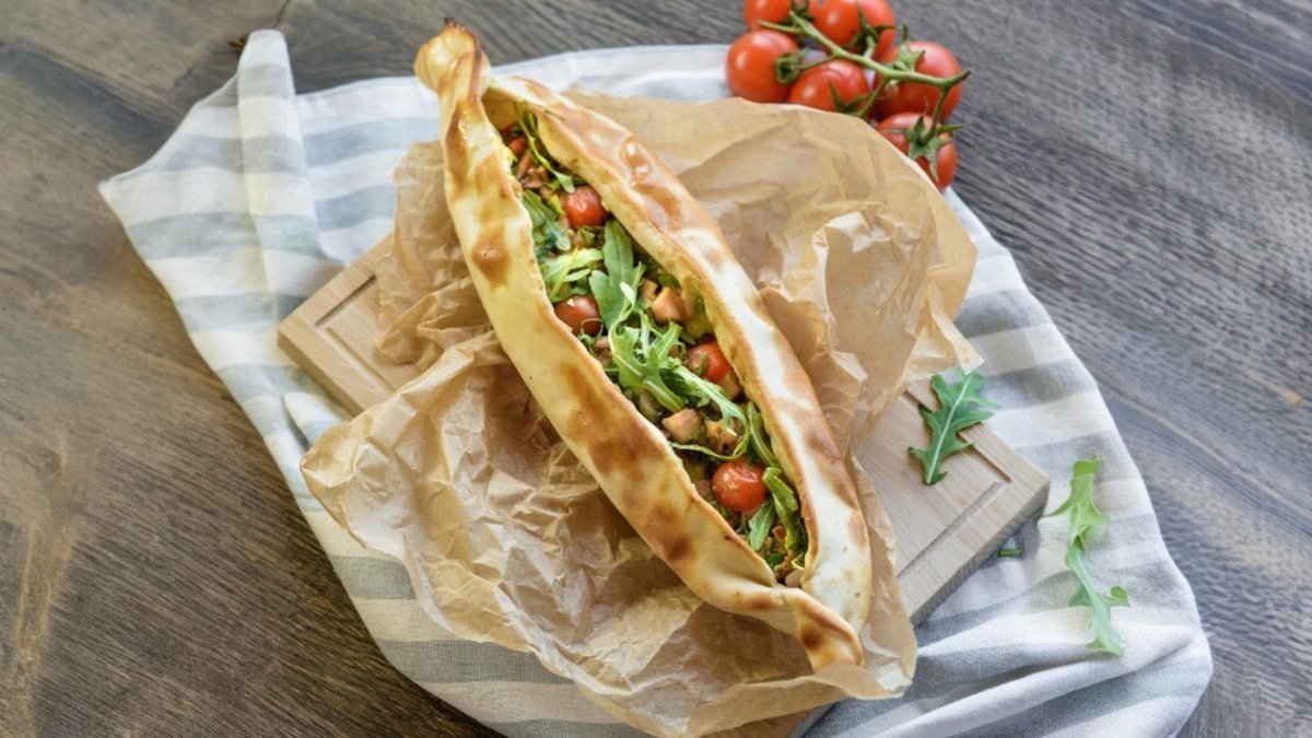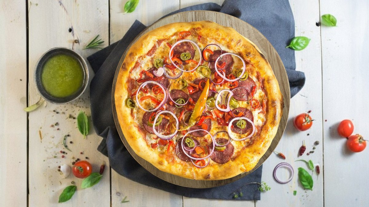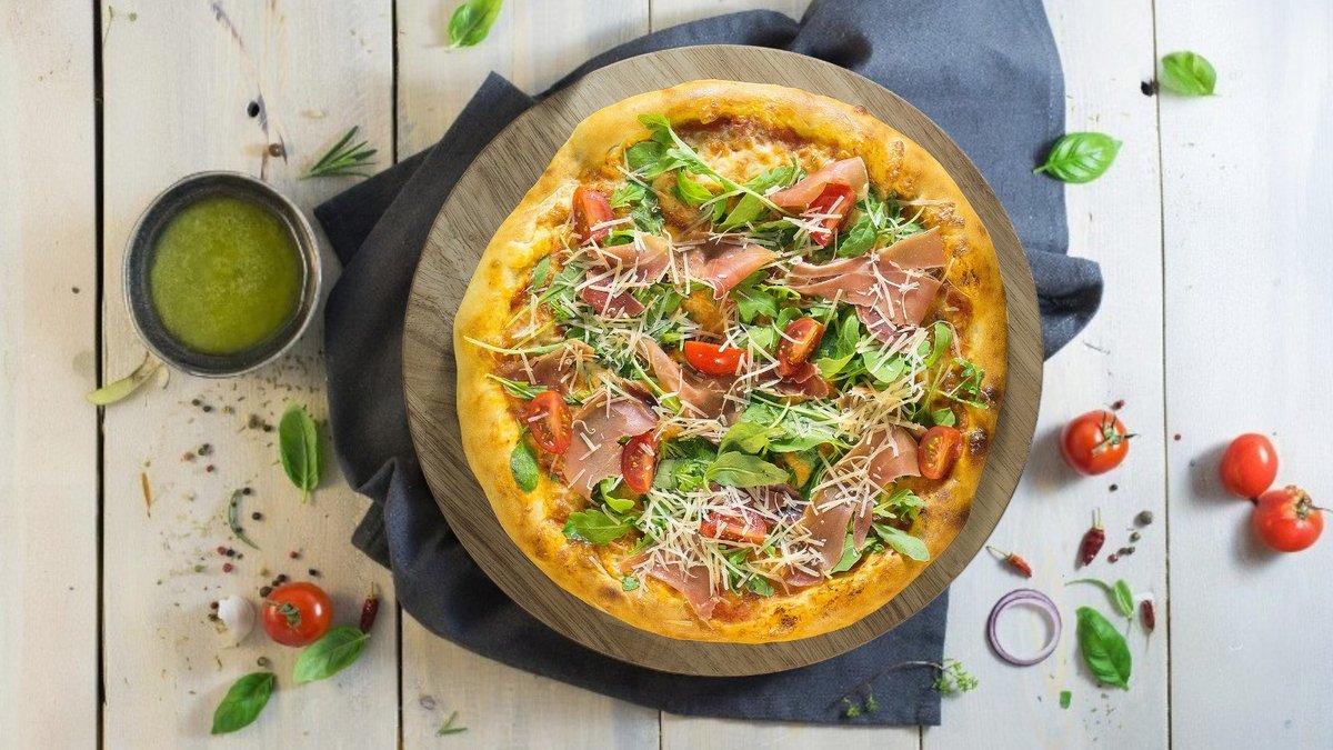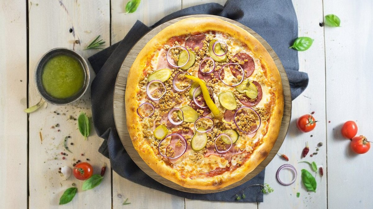Pomidorų padažas, sūris, karštai rūkyta šoninė, karštai rūkytas kiaulienos kumpis, alyvuogės, pomidorai, porai, krapai.