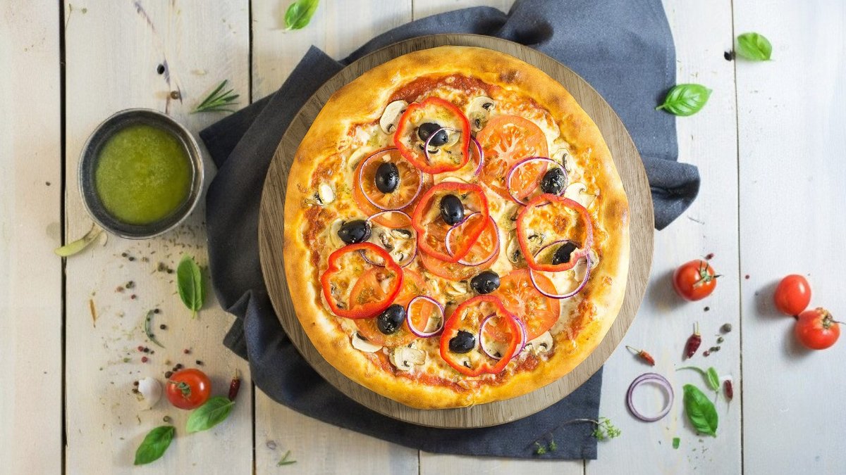 Pomidorų padažas, sūris, pievagrybiai, pomidorai, svogūnai, alyvuogės, paprika, žaliasis padažas.