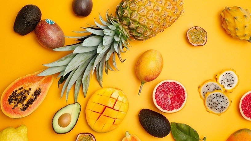 Platus šviežių vaisių, daržovių, mėsos, pieno produktų ir kasdienių prekių pasirinkimas