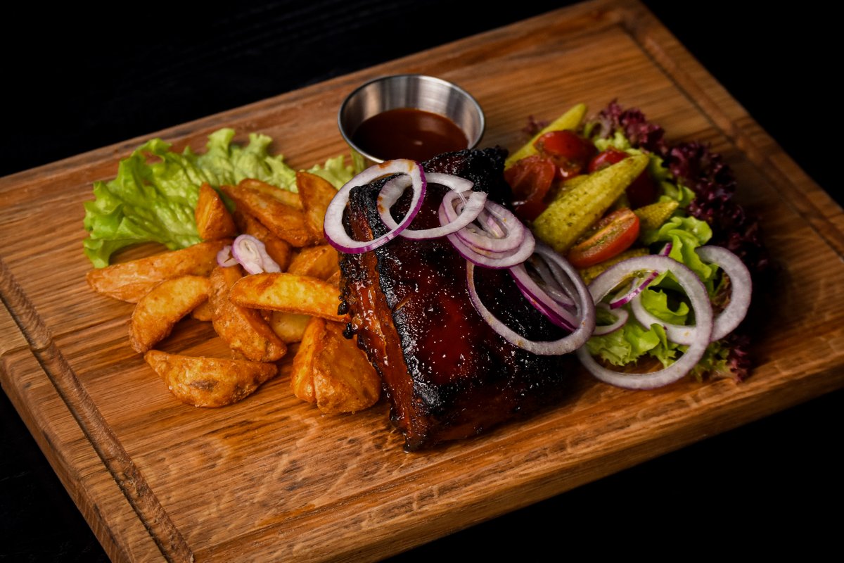 / kiaulienos šonkauliai, bulvių skiltelės, BBQ ir „Whiskey glaze“ padažas /