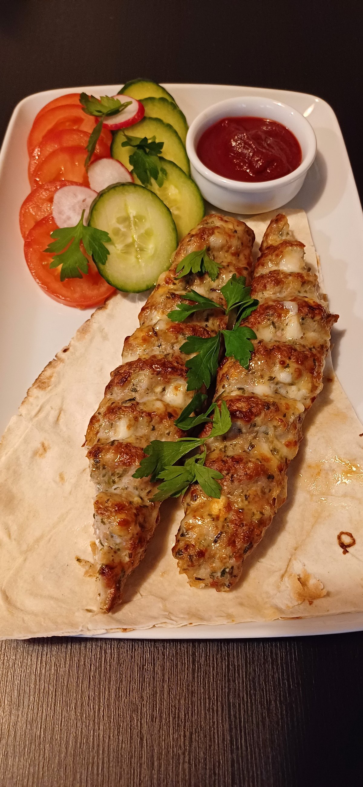 Pateikiama ant lavašo su daržovėmis ir padažu.