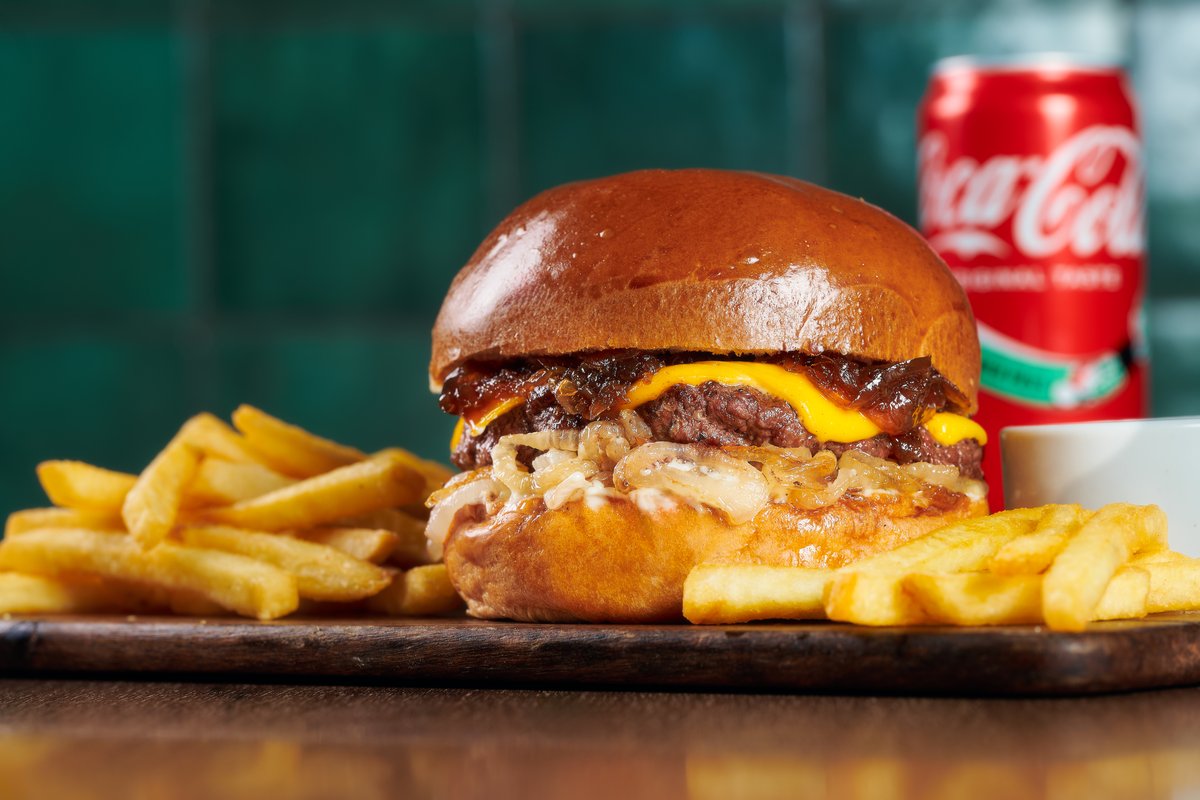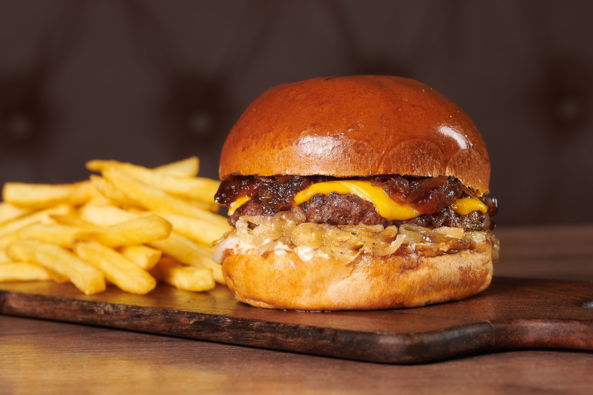 Jautiena, brandintas raudonasis čederis, traški šoninė, karamelizuoti svogūnai, rūkytų paprikų majonezas, naminis BBQ padažas