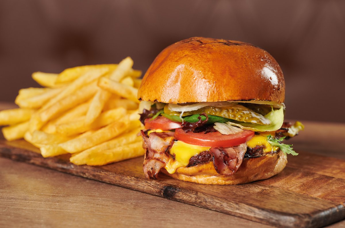 Jautiena, lydytas amerikietiškas Cheddar sūris, traški šoninė, traškūs kepti svogūnėliai, chipotle majonezas, bbq padažas, iceberg salota, pomidoras