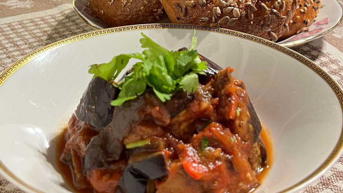 Užtepėlė iš keptų baklažanų, trintų pomidorų pagardinta česnaku, kalendra.