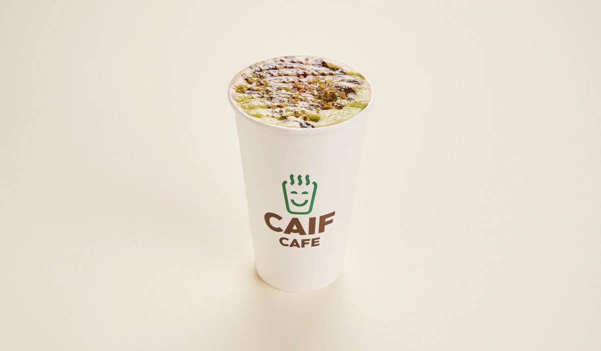 Latte su pistacijų ir šokolado padažu, papuoštas plakta grietinėle.