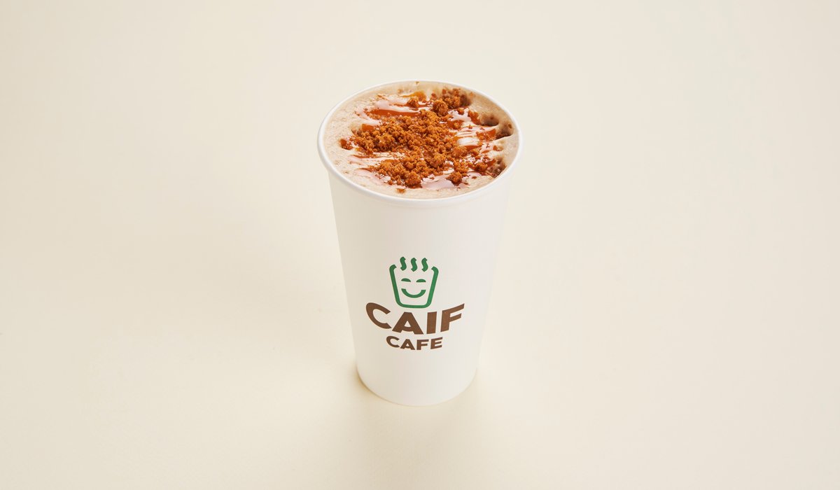 Latte su bananų ir toffee sirupais, papildytas karamele ir sausainių trupiniais.