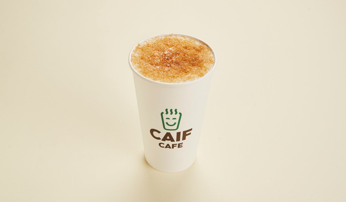 Latte su Creme Brulee sirupu, karamelės padažu ir traškiu cukraus sluoksniu