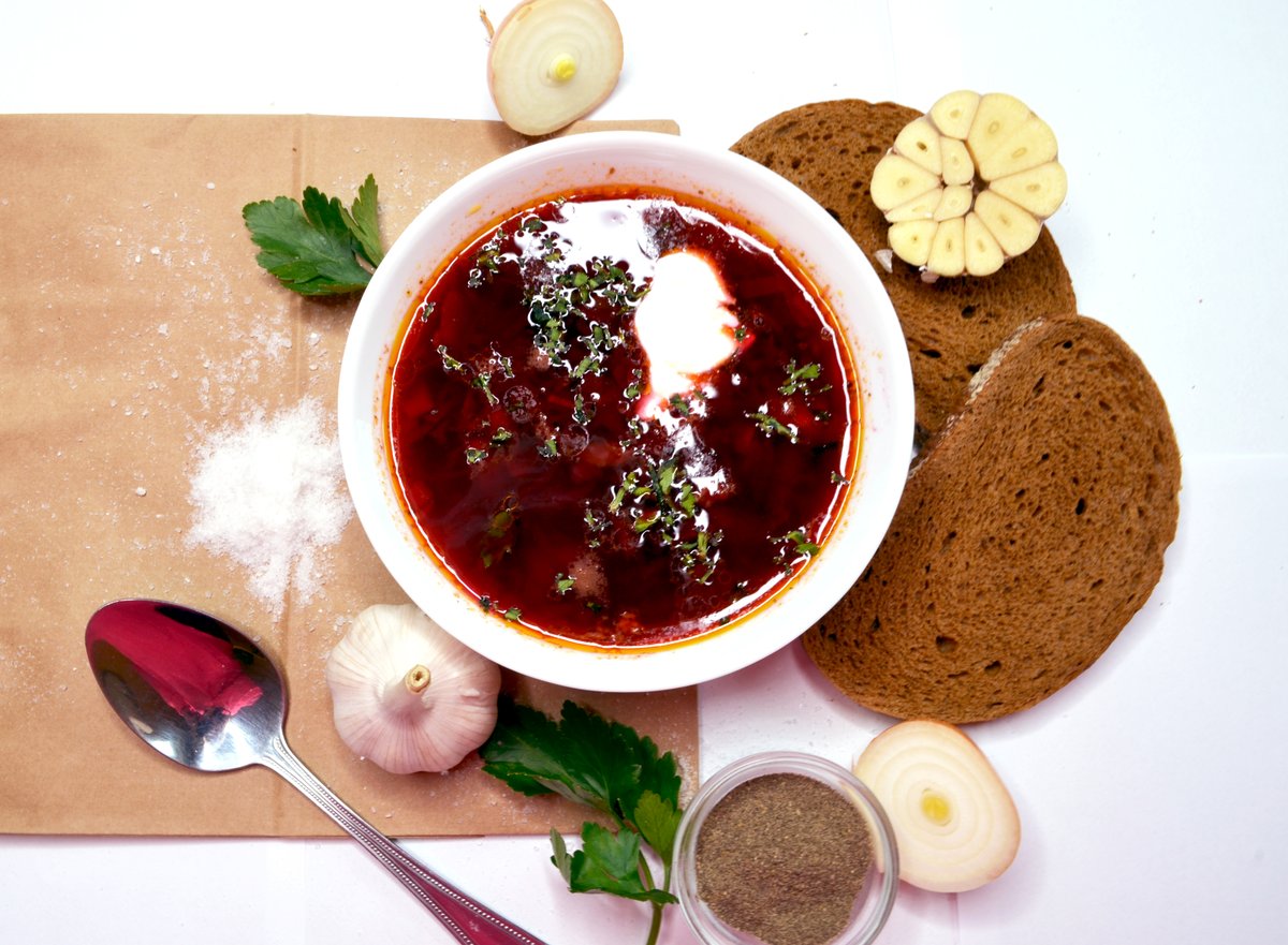 Burokėliai, bulvės, kopūstas, paprika, jautiena, svogūnai, česnakai, grietinė, kiauliena arba jautiena.