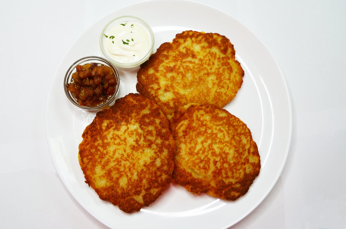 Bulvės, kiaušinis, druska, pipirai. Patiekiami su kiaulienos spirgučiais ir grietine
