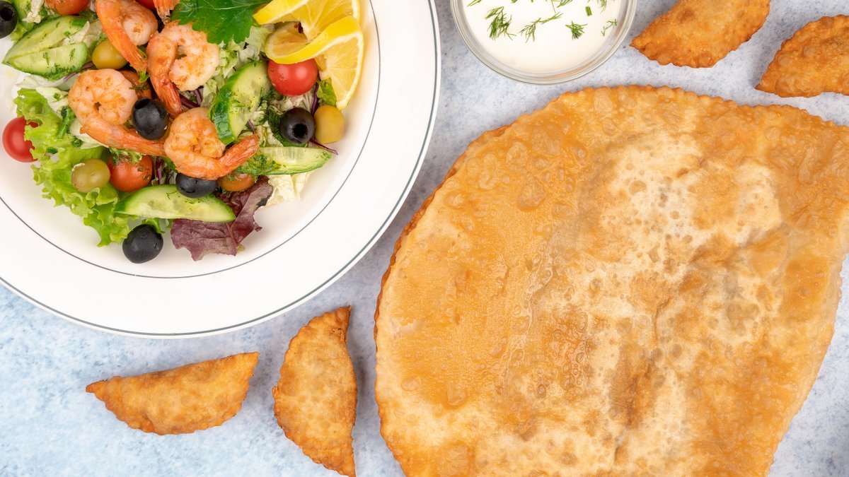 Vištienos krūtinėlė, solotų lapai, įvairios daržovės, padažas iš majonezo, grietinės.