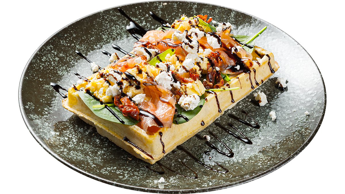 Vaflis patiekiamas su rūkyta lašiša, plėšyta kiaušiniene, fetos sūriu, saulėje džiovintais pomidorais, špinatų lapais, „Cezario“ padažu ir balzamiko acto kremu.