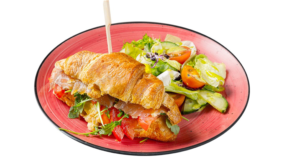Karštas kruasanas patiekiamas su rūkyta lašiša, dviem plaktais keptais kiaušiniaisplėšyta kiaušiniene, pomidorais, gražgarstėmis ir pikantišku padažu. Šalia – šviežių daržovių salotos.