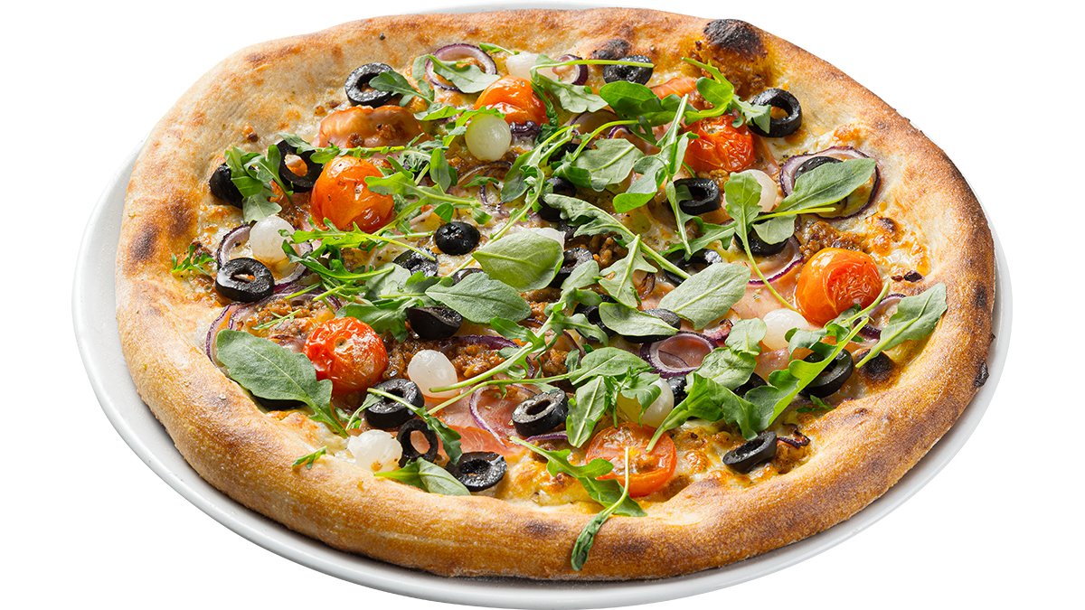 Malta jautiena ir kiauliena, svogūnai, peperoni pipirai, čili dribsniai, marinuoti svogūnėliai, spalvoti čili pipirai, mocarela, raudonėliai, pomidorų padažas, česnakinis aliejus.